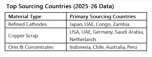 Secondary Copper (Recycling): A major shift in 2025-26 is the focus on Circular Economy. Scrap recycling now accounts for nearly 20-25% of the domestic supply. Large players like Hindalco are investing heavily in e-waste and scrap processing facilities to recover copper, reducing the need for virgin ore.