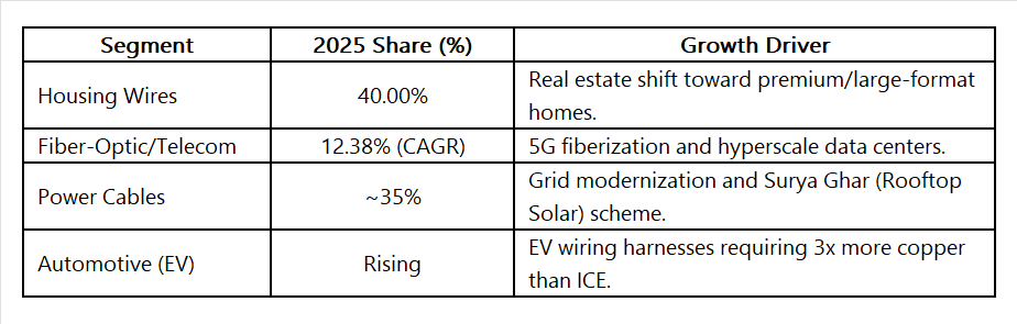 • Household Application: The "Housing for All" initiative and a 75% growth in luxury housing have increased the demand for high-quality, fire-retardant (FR) copper wires.