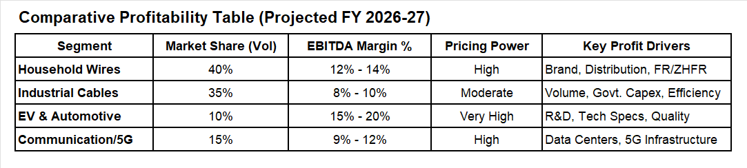 iii) Dynamics: Margins are driven by brand premium and a robust dealer-electrician network. Despite high competition, companies can pass on copper price hikes to retail consumers more easily than in large industrial contracts. In 2026, the shift toward Fire-Resistant (FR) and Zero-Halogen (ZHFR) wires is allowing for a "premiumization" of margins.