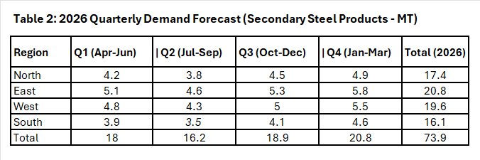 The industry expects a steady 8-9% growth in demand for FY 2025-26. Below is a projection of regional demand (in MT) for the secondary steel sector: