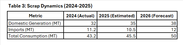 iii) 2026 Forecast: Imports are expected to stabilize at 12 MT as the sector adopts more Electric Arc Furnaces (EAF) which require higher-purity scrap to produce specialty steels.